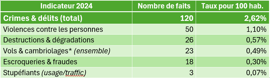 *Détail “vols & cambriolages” 2024 (extraits) : cambriolages de logement 3 (0,063 %), vols de véhicules 2 (0,051 %), vols dans véhicules 2 (0,051 %), vols violents sans arme 1 (0,027 %)
